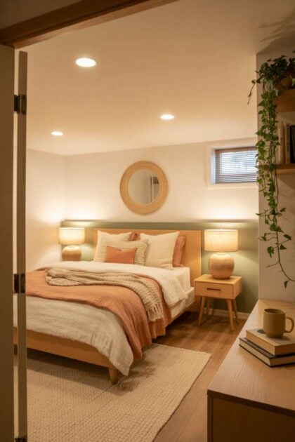Design Pro-Tip: In a below grade bedroom with no natural light, swap your standard recessed bulbs for warm-white LEDs in the 2700K range. This color temperature mimics the golden tone of late-afternoon sunlight and tricks your brain into reading the room as naturally lit. Avoid anything above 4000K — it’ll make the space feel like a dentist’s office.