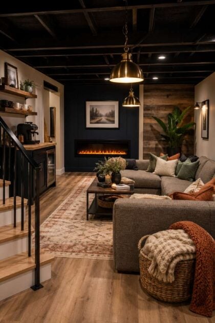 ![15 Cozy Basement Design Ideas That Banish the Cold Feel 6 ge 6] Alt text: A basement with a matte black painted exposed ceiling showing joists and ductwork, warm furnishings below, and brass pendant lights hanging down.](https://simplespaces.net/wp-content/uploads/cozy-basement-design-ideas-6.jpg)