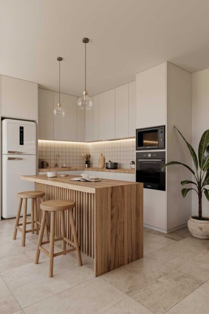 Wooden and white elements create depth in this modern minimal kitchen design. Beige tiles provide a neutral foundation.